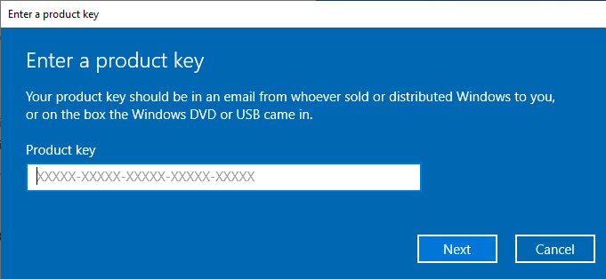- Select Change product key again and enter the purchased Windows 10 Professional license key.
